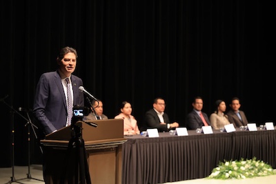 Durante su mensaje, el alcalde felicitó a los nuevos pasantes y reconoció el esfuerzo de sus familias, especialmente de sus padres, por haberlos apoyado para culminar sus estudios en una universidad pública de gran prestigio.