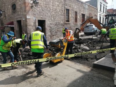 Morelia, Michoacán.- El Gobierno de Morelia, a través de la Secretaría de Obras Públicas, realiza este jueves trabajos de reparación de baches en la intersección de la calle Emiliano Zapata con la Avenida Morelos Norte, en el Centro Histórico de la ciudad, con el objetivo de mejorar la superficie de rodamiento y garantizar una circulación más segura.