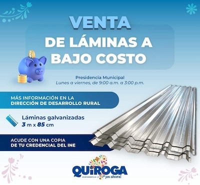 Como parte del compromiso de la administración municipal con el bienestar social, se encuentran disponibles láminas galvanizadas de 3.06 metros por 84 centímetros a un costo accesible, con el objetivo de contribuir a que más hogares puedan fortalecer y dignificar sus espacios.