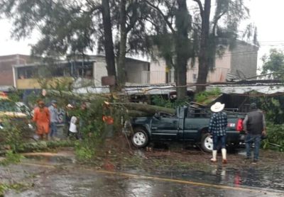 Los Reyes, Michoacán.-Se registro una tormenta, cuyas ráfagas de aire provocaron la caída de dos árboles, uno de ellos, sobre una camioneta y por fortuna no hubo personas lesionadas, generando encharcamientos en diversos puntos de la ciudad.