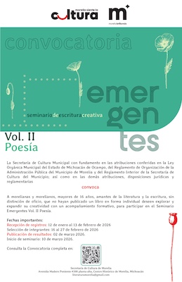 Leer másInvita Secretaría de Cultura de Morelia al seminario “Emergentes Vol. II Poesía”* La convocatoria estará abierta del 12 de enero