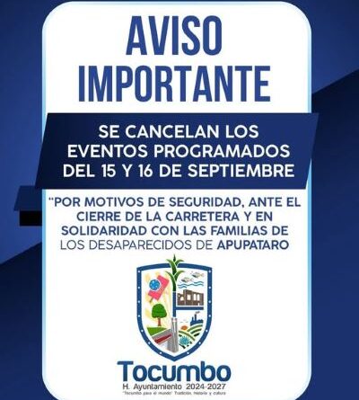 Tocumbo, Michoacán -El H. Ayuntamiento de Tocumbo 2024–2027, encabezado por el presidente municipal C.P. José Luis Alcázar Rodríguez, informa a la población que, debido a inquietudes de seguridad, a la incertidumbre de los cierres de la carretera y en un acto de solidaridad con nuestros vecinos de San José Apupátaro, además de las personas desaparecidas, se ha tomado la decisión responsable de cancelar los festejos patrios programados para los días 15 y 16 de septiembre.