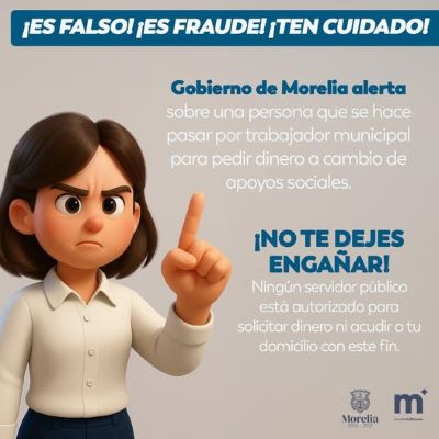 Se exhorta a las y los morelianos a no dejarse engañar ni entregar dinero bajo ningún concepto a personas que ofrezcan programas o beneficios a nombre del Ayuntamiento. Ningún servidor público está autorizado para solicitar recursos en lo individual ni acudir a domicilios particulares con este fin.