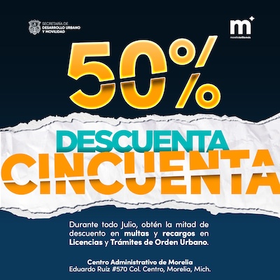 Morelia, Michoacán a 1° de julio de 2025.- Con el objetivo de apoyar a la ciudadanía y facilitar la regularización de trámites, el Gobierno de Morelia bajo las instrucciones del presidente Alfonso Martínez Alcázar, lanza “¡Descuenta 50%!”, una campaña especial de condonación de recargos y multas, que estará vigente del 1° al 31 de julio de 2025, dirigida a personas que tengan adeudos en tres rubros importantes: trámites urbanos, construcción o vivienda, y licencias de funcionamiento.