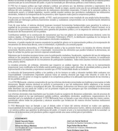 El PRD Michoacán reiteró que el proceso de discusión de la reforma electoral debe considerar la participación de instituciones electorales, especialistas, organizaciones civiles y ciudadanía, con el objetivo de que las modificaciones legales mantengan condiciones de competencia política, reglas claras para los procesos electorales y un sistema de representación que refleje la diversidad política del país.