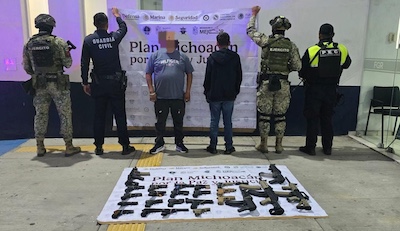 Morelia, Michoacán.- Un hombre y un menor de edad fueron detenidos en posesión de 24 armas de fuego, en un operativo interestatal y del reforzamiento a las acciones para la disuasión del delito entre Michoacán y Guanajuato.