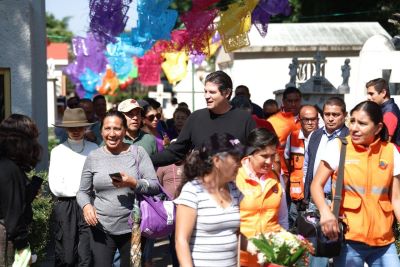 A su paso, el Presidente Municipal saludó a las familias que compartían un momento con sus seres queridos, acompañados de comida, música o tan solo conversando en torno a las lápidas adornadas y limpias.