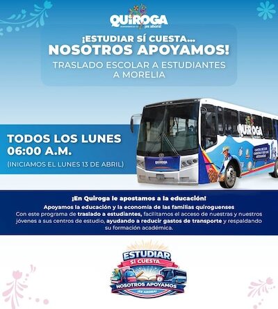 El servicio iniciará este lunes 13 de abril, con salidas todos los lunes a las 6:00 de la mañana desde la Presidencia Municipal de Quiroga, permitiendo a las y los estudiantes trasladarse de manera segura y gratuita a la capital del estado.