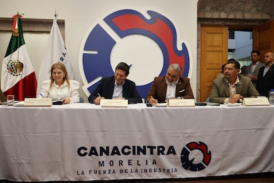 Morelia, Michoacán.- Con el objetivo de consolidar una estrategia efectiva de vinculación entre el sector productivo y el gobierno municipal, el presidente, Alfonso Martínez Alcázar, fungió como testigo de honor en la firma del convenio de colaboración entre el Ayuntamiento de Morelia, a través de la Secretaría de Fomento Económico (Sefeco), y la Cámara Nacional de la Industria de Transformación (Canacintra), orientado a fortalecer la bolsa de trabajo y ampliar las oportunidades laborales para la ciudadanía.
