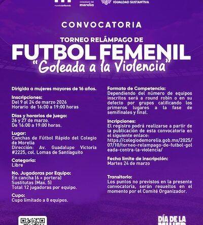 Morelia, Michoacán.- En el marco de la conmemoración del Día Internacional de la Mujer (8M), el Gobierno de Morelia invita a participar en el torneo relámpago de fútbol femenil “Goleada a la Violencia”, iniciativa que busca promover el deporte, la convivencia y espacios seguros para las mujeres en la capital michoacana.