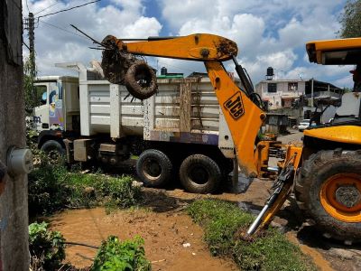 Con el apoyo de una retro excavadora y un volteo, se llevó a cabo el retiro de basura, llantas, bolsas, envases, ramas y lodo que impedían el flujo libre del agua al obstruir los tubos por la acumulación de desechos debido al arrastres por las fuertes lluvias que se han registrado en el lugar.