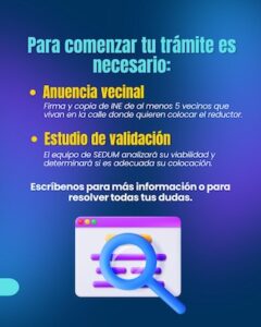 Este procedimiento permite atender solicitudes ciudadanas, y evaluar la viabilidad de colocar estos dispositivos en zonas donde se requiera disminuir la velocidad de los vehículos, particularmente en calles con alto flujo peatonal, o cercanas a escuelas y espacios comunitarios.