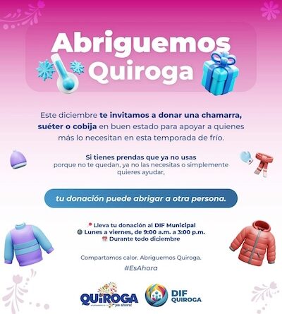 Por lo que, en coordinación con el Sistema DIF Quiroga, la administración municipal hace un llamado a la ciudadanía para donar chamarras, suéteres o cobijas en buen estado, prendas que serán entregadas a familias que más lo necesitan durante diciembre.