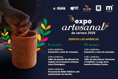 Morelia, Michoacán.- El Gobierno de Morelia que encabeza el presidente municipal, Alfonso Martínez Alcázar, por medio de su Secretaría de Cultura (SeCultura) invita a ciudadanos y visitantes a la Expo Artesanal de Verano 2025, que tendrá lugar este 9 y 10 de agosto de 11:00 a 19:00 horas en Espacio Las Américas.