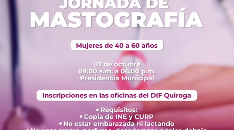 Quiroga, Michoacán – “Prevenir salva vidas, por eso hacemos un llamado a todas las mujeres a aprovechar esta jornada gratuita y sumarse a la cultura del autocuidado”, expresó la presidenta municipal de Quiroga, Alma Mireya González Sánchez, al anunciar la Jornada de Mastografía que se llevará a cabo el próximo 7 de octubre, de 9:00 de la mañana a 6:00 de la tarde, en la Presidencia Municipal.