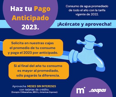 Morelia, Michoacán.- El Organismo Operador de Agua Potable, Alcantarillado y Saneamiento de Morelia (OOAPAS) extenderá el Programa de Pago Anticipado todo el mes de febrero, para que los morelianos paguen el agua del 2023 con la tarifa del 2022.