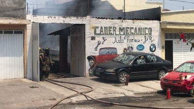 Morelia, Mich. Se registró el incendio  de un taller mecánico y deshuesadero, ubicado en la Colonia Lago I, que consumió al menos 10 vehículos chatarra.
