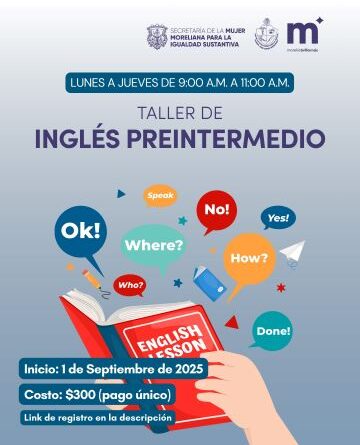 • Curso de Inglés – Nivel Pre-Intermedio. Inicia el 1 de septiembre de 2025 y finaliza el 30 de enero de 2026. Se imparte de lunes a jueves de 9:00 a 11:00 horas en la Semmujeris. Costo único: $300. Registro en: https://forms.gle/jSWFgesUL1qTsJHL8