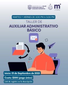 • Curso de Auxiliar Administrativo – Nivel Básico. Inicia el 1 de septiembre de 2025 y finaliza el 30 de enero de 2026. Se imparte martes y viernes de 15:00 a 17:00 horas en la Semmujeris. Costo único: $300. Registro en: https://forms.gle/aFFCoqdqEbs4kNSS6