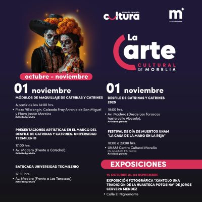 Por otro lado, en UNAM Centro Cultural Morelia llevará a cabo el Tercer Festival de Día de Muertos “La Casa de la Mano en la Reja”, con diversas actividades a lo largo del día 1 de noviembre. Mientras, en el Andador El Nigromante se mantendrá la exposición fotográfica “Xantolo, una tradición de la Huasteca Potosina” del artista Jorge Cervera Méndez.